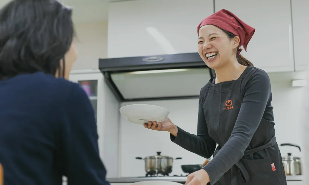 プチパーティは、コープ自然派の食材で作った料理を実際に召し上がっていただきながら、食生活について想いを深めていただく貴重な場。始めは先輩スタッフに同行して一連の流れを覚えるところからスタート。現場担当スタッフは、事前準備から調理、商品説明、利用のご案内まですべてひとりで行ないます。